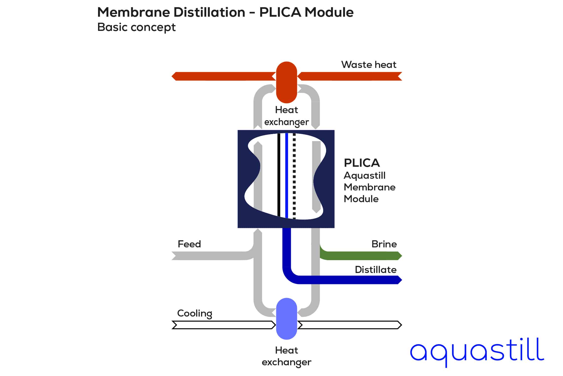 The world has a great need for clean water and, on the other hand, has excessive waste heat and solar heat sources. Aquastill membrane distillation uses these heat sources to extract pure water from saline water. Aiming to produce safe drinking or purified water.